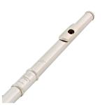 Handmade flute with britannia silver headjoint, body and footjoint, silver plated nickel silver key mechanism. Open holes, French style pointed tonearms, drawn toneholes, partial Brögger System
